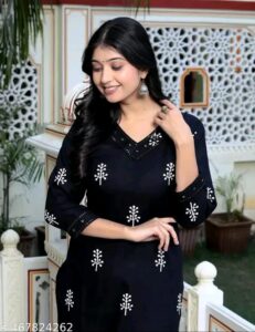 Step into timeless elegance with the Agoka.I Long Kurti, featuring a classic black base adorned with delicate buti-style floral prints. Made from premium rayon fabric, this kurti offers a perfect blend of style and comfort, ideal for all-day wear.